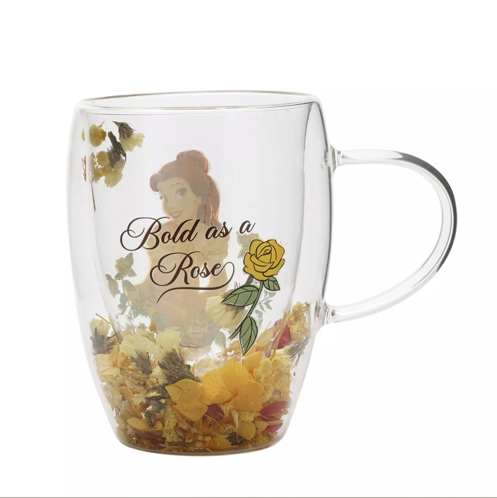 Step into the enchanting world of Disney with the Disney Pastel Princess Glass Mug with Dried Flowers – Belle. This enchanting clear glass mug showcases a vibrant image of the beloved red-haired Belle, seated amidst a blooming arrangement of yellow and orange flowers. An ideal gift for Disney enthusiasts or a whimsical addition to any own collection.
