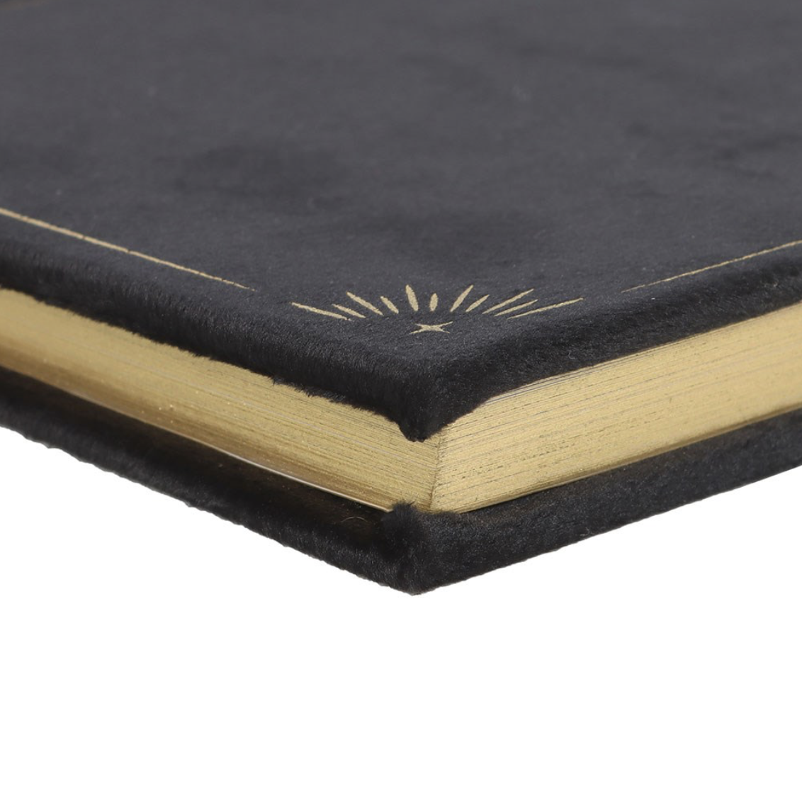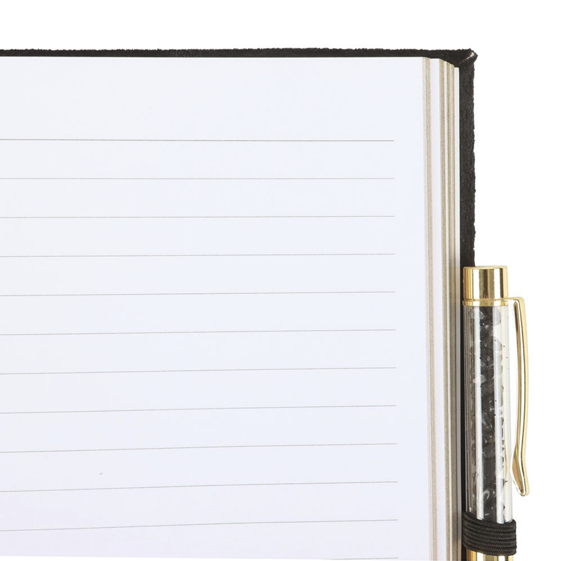 Jot down spells, rituals and mystical insights in this Book of Shadows journal with lined pages. This black journal features mystical, metallic gold detailing on the cover and a gold ribbon page marker, paired with a sleek black obsidian crystal pen known for its protecting and grounding properties. 100 sheets / 200 lined pages.
