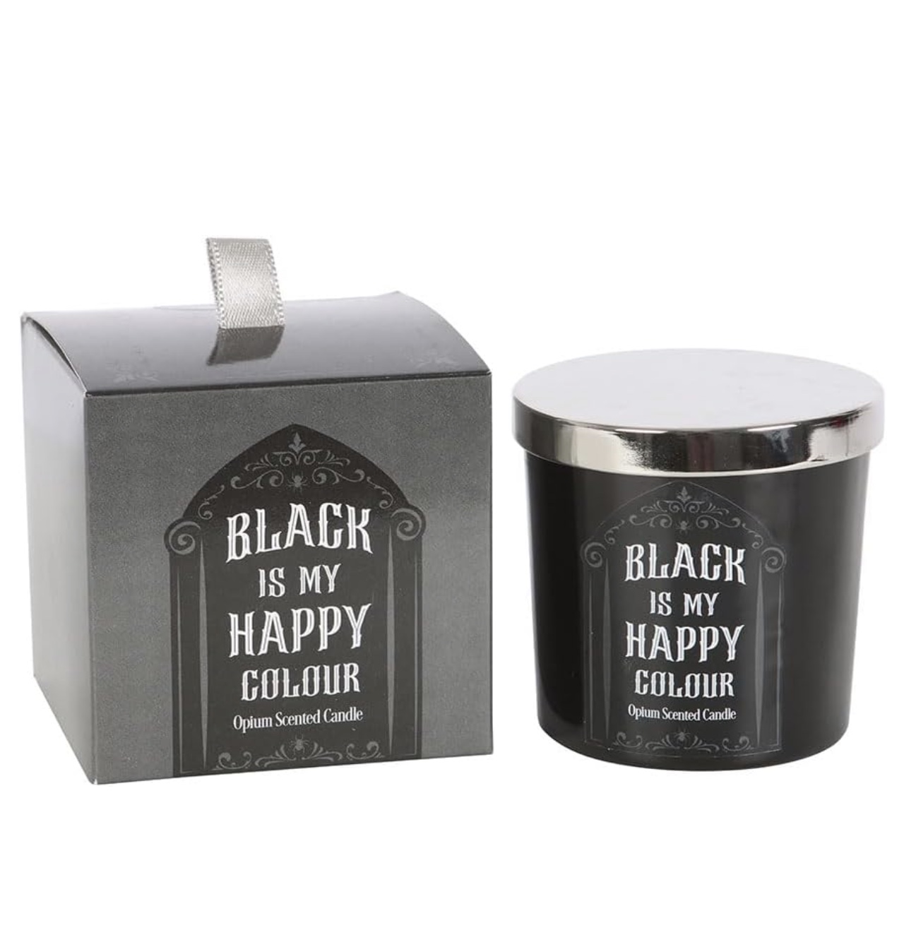 Show off your bright and sunny personality with this cheeky fragranced candle. Features ‘Black is my happy colour’ text in a black opium scent that’s perfect for cloudy days and cosy, dark nights in your crypt. Presented in a matching gift box. Vegan. Approximate total burn time of 25 hours. Do not burn for more than 4 hours at a time.