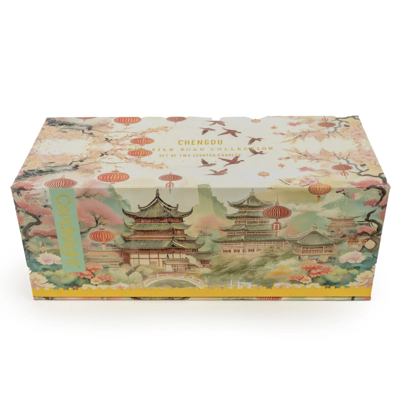 Inspired by the blossom-strewn vistas and pagodas of Chengdu, this set of two scented candles from The Silk Road Collection brings a quietly luxurious ambience to any room. Each jade-green glass votive is wrapped with intricate artwork of lanterns and temples accented in soft gold, creating a serene focal point on a coffee table, mantlepiece, or bedside. The candles are presented in a beautiful, book-style keepsake box with coordinating design and gilded edging, making a thoughtful gift and a pleasure to open. Once the wax is spent, the decorative glasses can be repurposed for tealights or small trinkets, ensuring their beauty lasts long after the final flicker.
