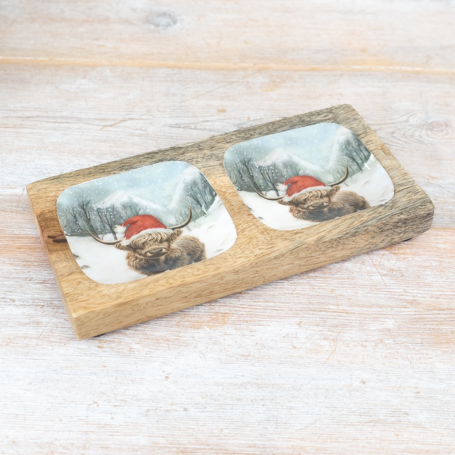 A rustic mango wood tray with a colourful highland cow design. A must have seasonal kitchenware item.