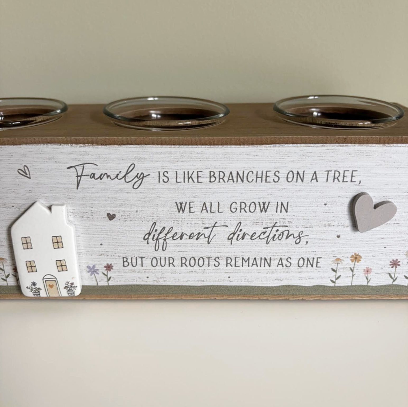 A charming wooden display box with three glass holders, beautifully finished with a family‑themed design and the heartfelt message: “Family is like branches on a tree… we all grow in different directions, but our roots remain as one.” A lovely decorative piece for any home.