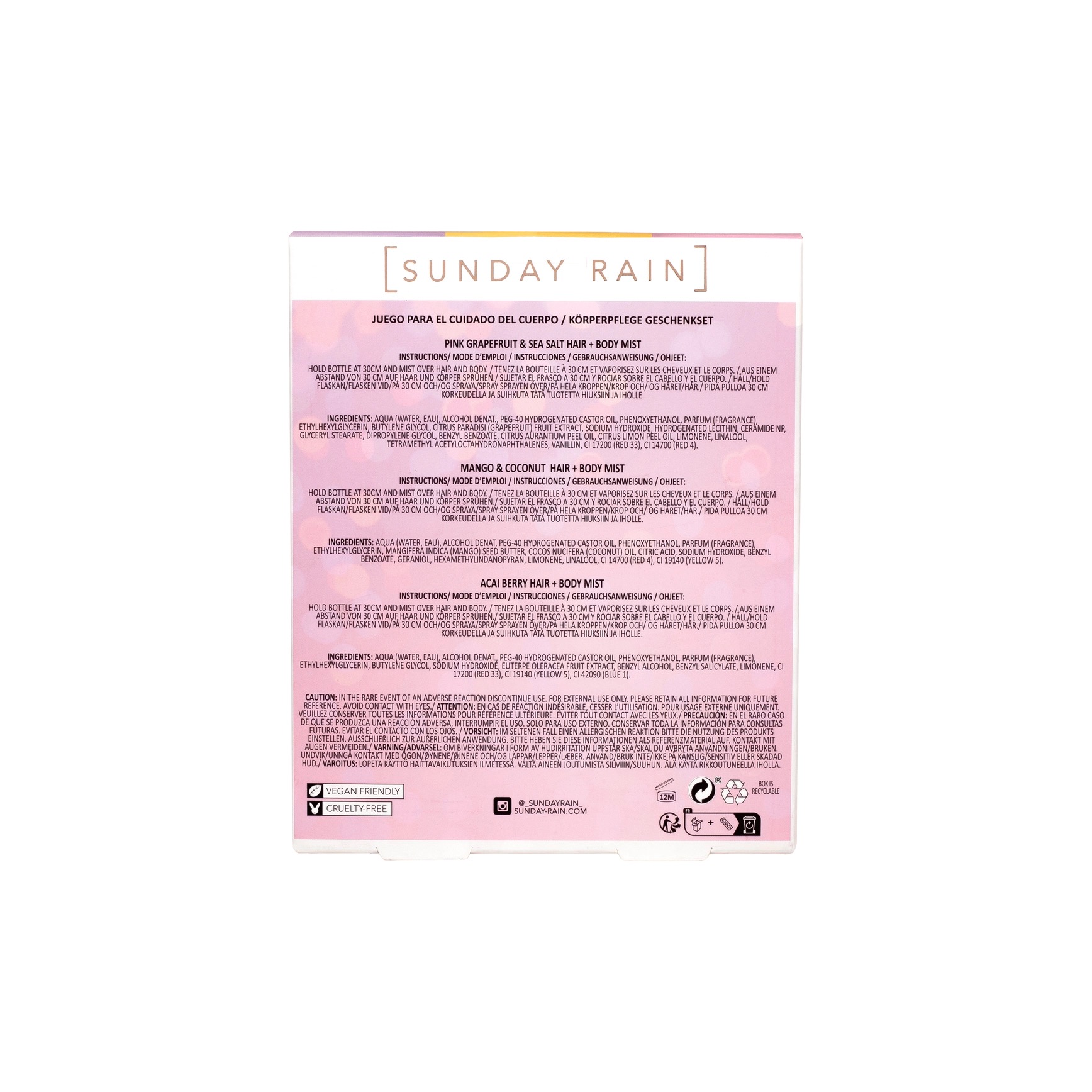 A trio of sweet-smelling mists that are perfect for spritzing everyday! Discover your signature scent and spritz it onto your hair and skin for an instantly sweet and refreshing boost. Choose either a thrilling fruity mist that transcends the senses to exotic horizons and uplifting summer days with our Pink Grapefruit & Sea Salt, also infused with Ceramides to replenish those skin proteins! Or our Mango & Coconut body mist that will leave you feeling instantly refreshed and smelling like a ripe and juicy mango from head to toe! Finally get one of your five a day with our rejuvenating and succulent Acai Berry mist. Just spray your desired amount and watch the compliments roll in!