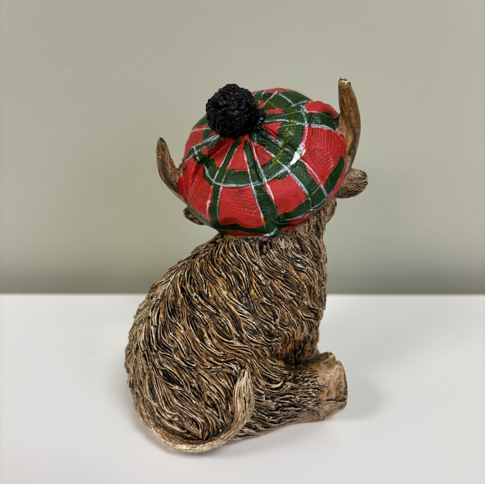 A stunningly adorable highland cow ornament featuring a tartan hat. Perfect for adding a touch of farmhouse charm to any room.