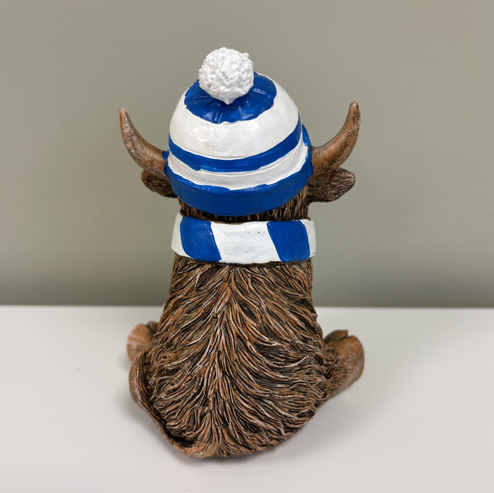 ntroducing our delightful highland cow ornament, complete with a charming blue and white striped hat and scarf.