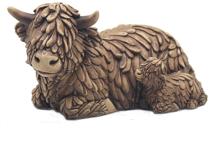 Introducing Hughie the Highland Cow and Calf! This adorable set is sure to bring a smile to your face. Hughie is a majestic and friendly highland cow, standing proud with his curly horns and long shaggy fur. His calf is just as sweet, with its big brown eyes and soft fur. A lovely addition to any home.