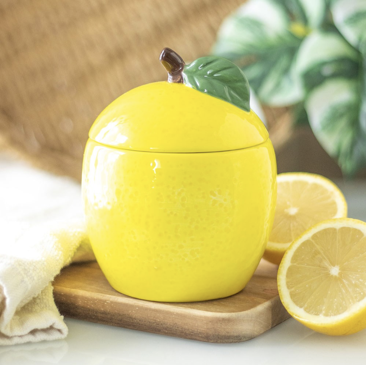 Add some zest to your space with this fun candle jar, shaped like a freshly picked lemon. Both functional and adorable, this scented candle doubles as a delightful decor item for kitchens, living rooms and more. Approximate burn time of 16 hours. Please practice caution when burning and never leave lit candle unattended.