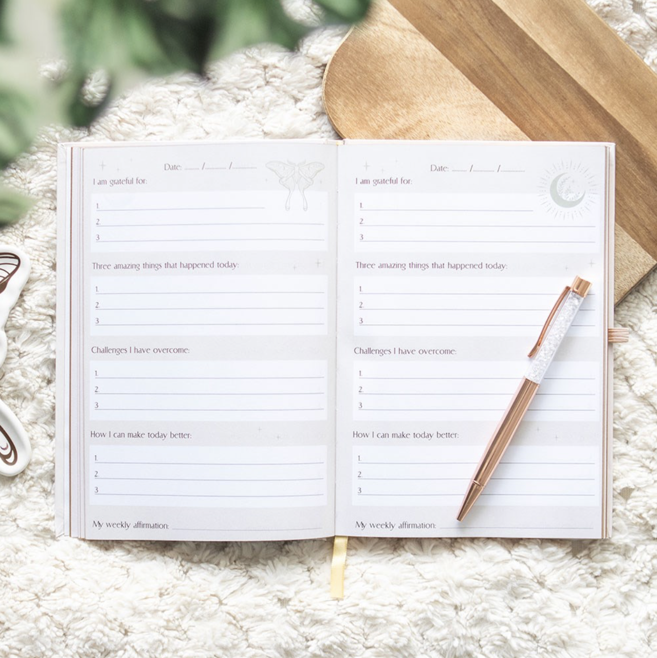 Connect with your inner thoughts with this daily reflection journal. Take note of daily reflections, gratitude practices and the exploration of your dreams with a matching clear quartz pen for promoting clarity and positive energy. Featuring an elegant luna moth design which symbolises inner guidance and intuition, this journal is just what you need to manifest your best self. 100 sheets / 200 printed pages.