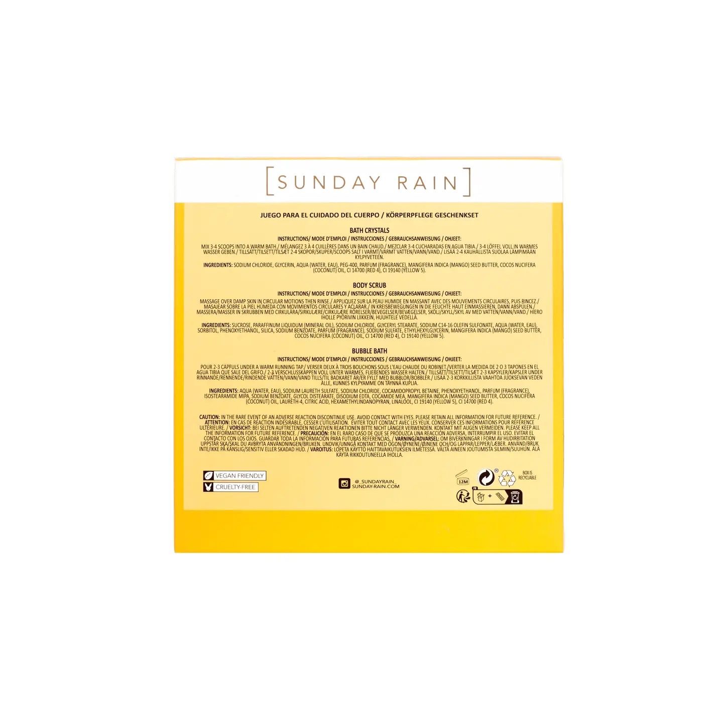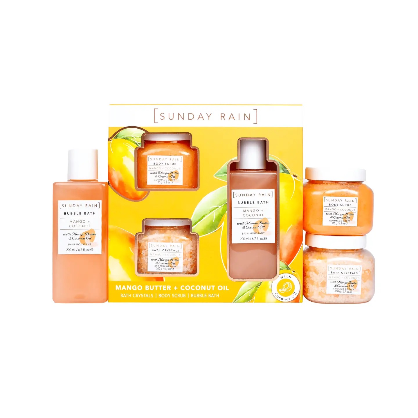 Ingredient: Mango + Coconut Body Scrub: Sucrose, Paraffinum Liquidum (Mineral Oil), Sodium Chloride, Sodium Lauryl Sulfate, PEG‑100 Stearate, Glyceryl Stearate, Phenoxyethanol, Sodium Benzoate, Parfum (Fragrance), Silica, Ethylhexylglycerin, Mangifera Indica (Mango) Seed Butter, Cocos Nucifera (Coconut) Oil, CI 15510 (Orange 4), Coumarin, Limonene, Linalool. Mango + Coconut Bath Crystals (This formula matches the verified Sunday Rain bath crystal base used across their ranges.) Sodium Chloride, Parfum (Fragrance), Mangifera Indica (Mango) Seed Butter, Cocos Nucifera (Coconut) Oil, Silica, CI 15510 (Orange 4), Coumarin, Limonene, Linalool. Mango + Coconut Bubble Bath: Water (Aqua), Sodium Laureth Sulfate, Sodium Chloride, Cocamidopropyl Betaine, Glycol Distearate, Laureth‑4, PEG‑150 Distearate, Isostearamide MIPA, Parfum (Fragrance), Mangifera Indica (Mango) Seed Butter, Cocos Nucifera (Coconut) Oil, Citric Acid, Disodium EDTA, Sodium Benzoate, Methylchloroisothiazolinone, Methylisothiazolinone, Magnesium Nitrate, Magnesium Chloride, CI 15510 (Orange 4), Coumarin, Limonene, Linalool.
