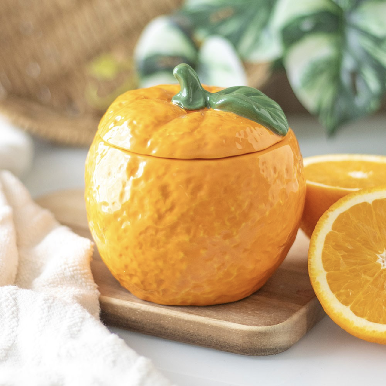 Add some zest to your space with this fun candle jar, shaped like a freshly picked orange. Both functional and adorable, this scented candle doubles as a delightful decor item for kitchens, living rooms and more. Approximate burn time of 16 hours. Please practice caution when burning and never leave lit candle unattended.