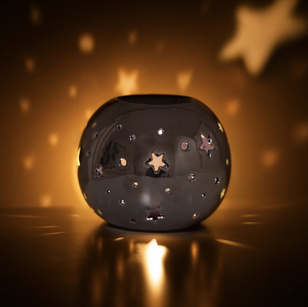 This purple iridescent oil burner and wax warmer adds a beautiful blend of mystic and whimsy to any space. With a radiant, shifting purple hue, it glows beautifully as light dances through the star-shaped cut outs. Pair with a relaxing fragrance oil or wax melts and enjoy the soothing aroma and gentle glow.