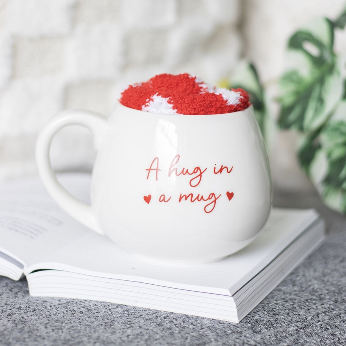 Give someone a ‘warm and fuzzy’ feeling with this mug and socks set. Featuring ‘Hug in a mug’ text and a pair of red and white heart socks, you’re sure to warm hearts and toes, all at once! Presented in a matching box that’s perfect for gifting. 500ml capacity. Microwave and dishwasher safe.