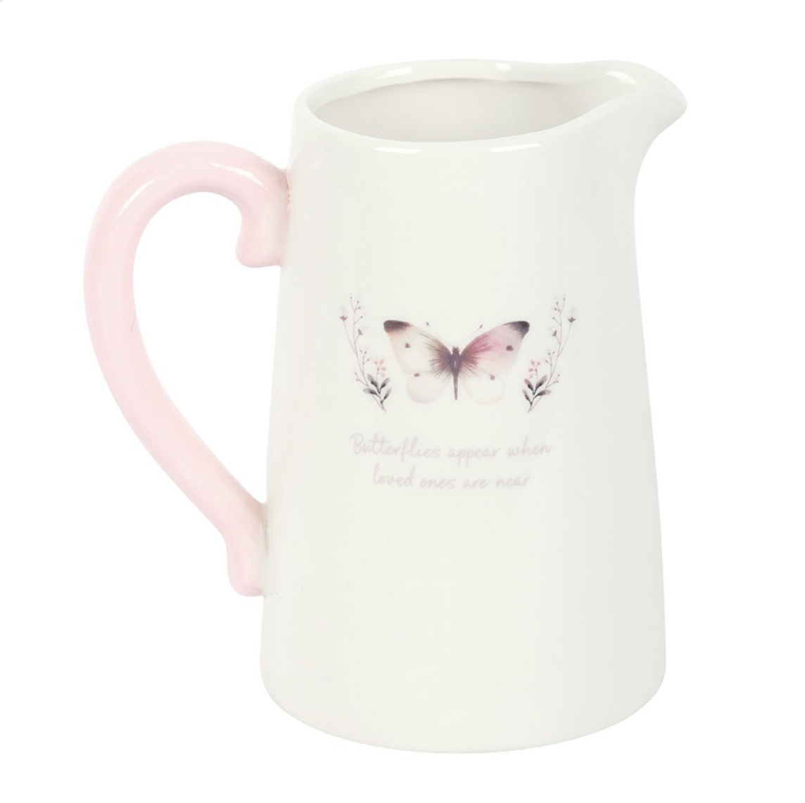 Add a thoughtful touch to the home with this decorative ceramic jug, perfect for displaying fresh blooms or dried flowers. Featuring a delicate grey butterfly design and the heartfelt words ‘Butterflies appear when loved ones are near’, this piece makes a meaningful gift for anyone cherishing the memory of someone special. Not food safe.